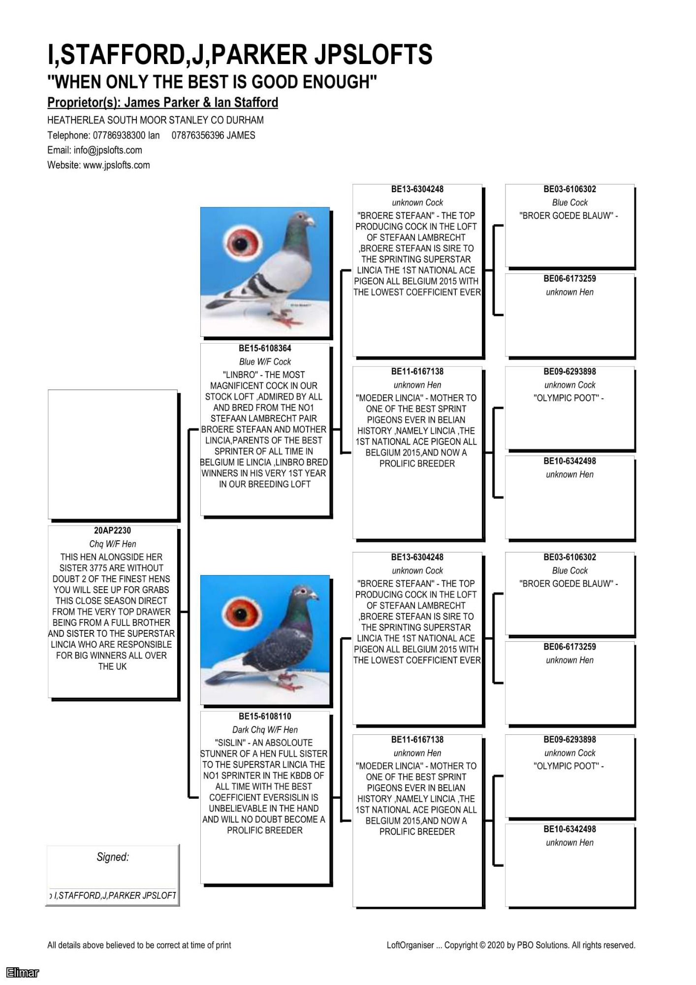 Here are our principal Stefaan Lambrechts breeders and their pedigrees. Spearheading the Lambrechts brigade we have the super breeder "YOUNG LINCIA 966". The others are mainly Double G.Children of "BROTHER STEFAAN" the cock who bred KBDB Champion "LINCIA"